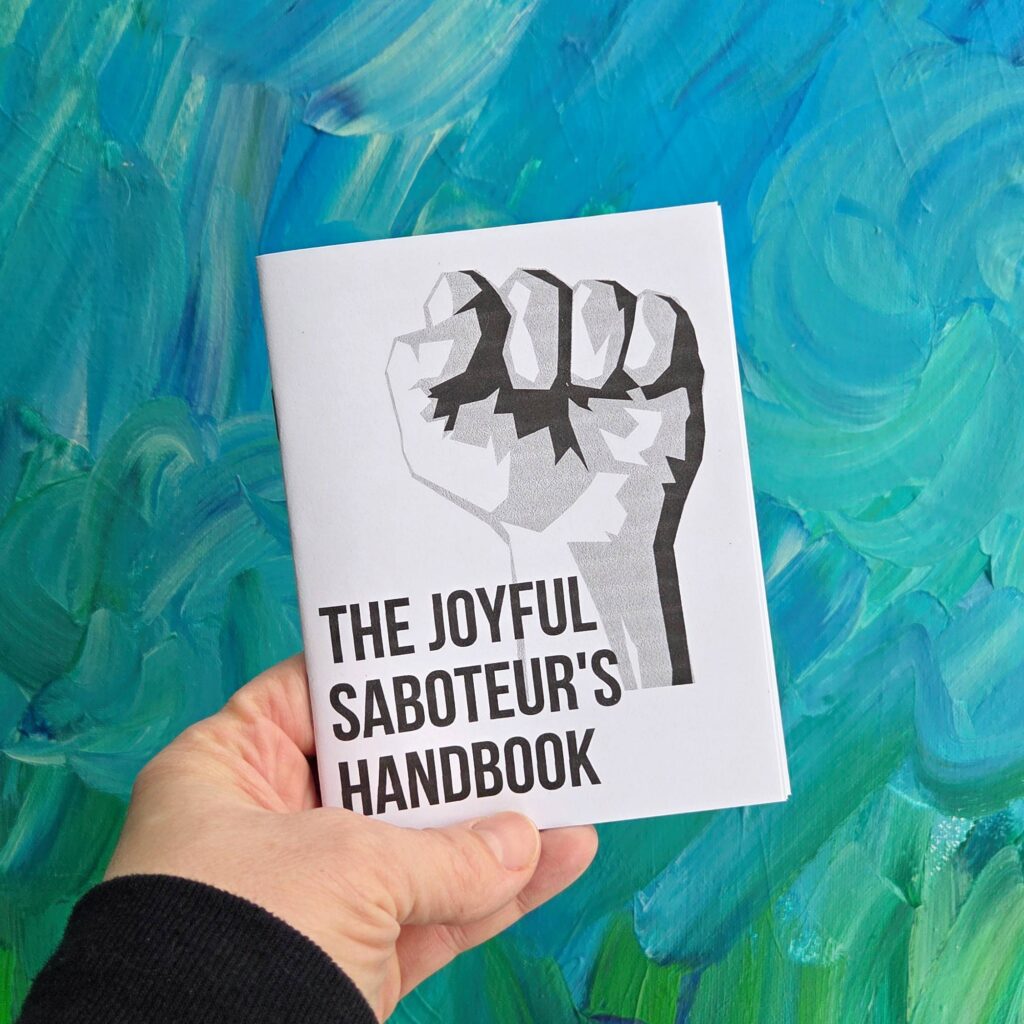 The Joyful Saboteur’s Handbook is the follow-up zine to How to Survive the Fall of Democracy with Joy and Whimsy in Your Heart. The first zine focused on staying human in unprecedented times. This one focuses on real life acts of resistance that people have used to challenge authority.